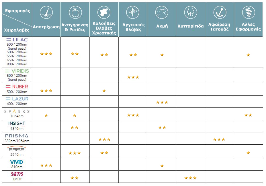 Χειρολαβές Λέιζερ. Μικρό Μέγεθος, Μεγάλη Απόδοση Η υψηλές επιδόσεις των πηγών λέιζερ για θεραπείες, αγγειακών και μελαγχρωματικών βλαβών, επεμβατικής και μη επεμβατικής αναζωογόνησης δέρματος, αφαίρεσης τατουάζ και για in motion αποτρίχωσης (και παράλληλα πολλές άλλες εφαρμογές), σε συνδυασμό με των μικρών διαστάσεων σχεδιασμό τους, εξασφαλίζουν εύκολο χειρισμό και μικρό βάρος. Οι χειρολαβές Sparks, Insight και Vivid με ενσωματωμένη ψύξη προσφέρουν μέγιστη ασφάλεια και άνεση θεραπείας.